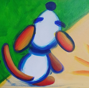 2020De kleur van liefde, vuur, lieveheersbeestjes en aardbeien. De kleuren pracht van de specht combineert heel goed bij de Mondriaan kleuren. Dit schilderij hangt gekantelt met een hoek van 45 graden, net als de Victory boogie woogie van Mondriaan.